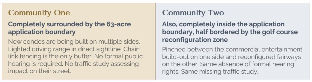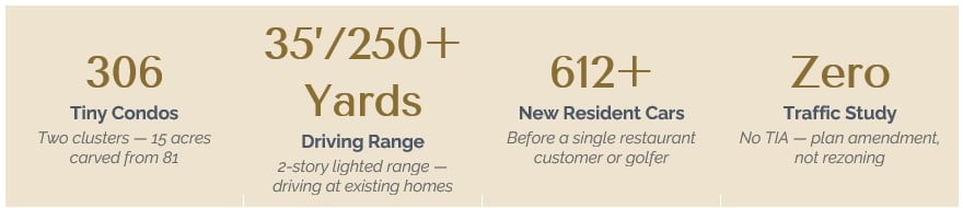 This application proposes 306 new stacked condos AND a commercial entertainment complex — including a lighted driving range, night golf, and a mid-course restaurant — in a residential PRC community. No traffic study has been required. No lighting plan has been filed. Two prior attempts to redevelop this property failed through the proper Comprehensive Plan process.