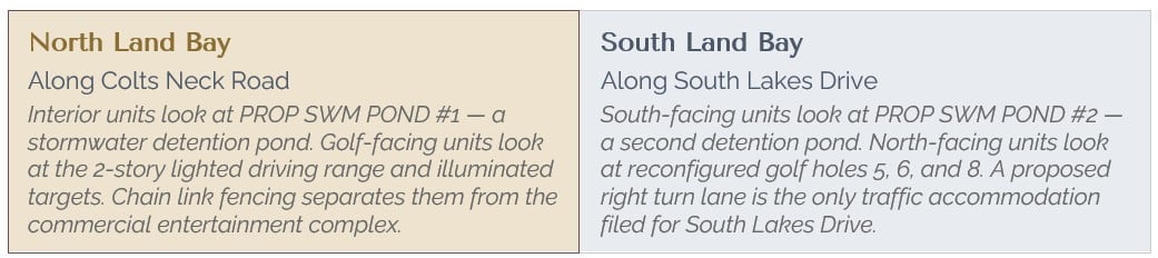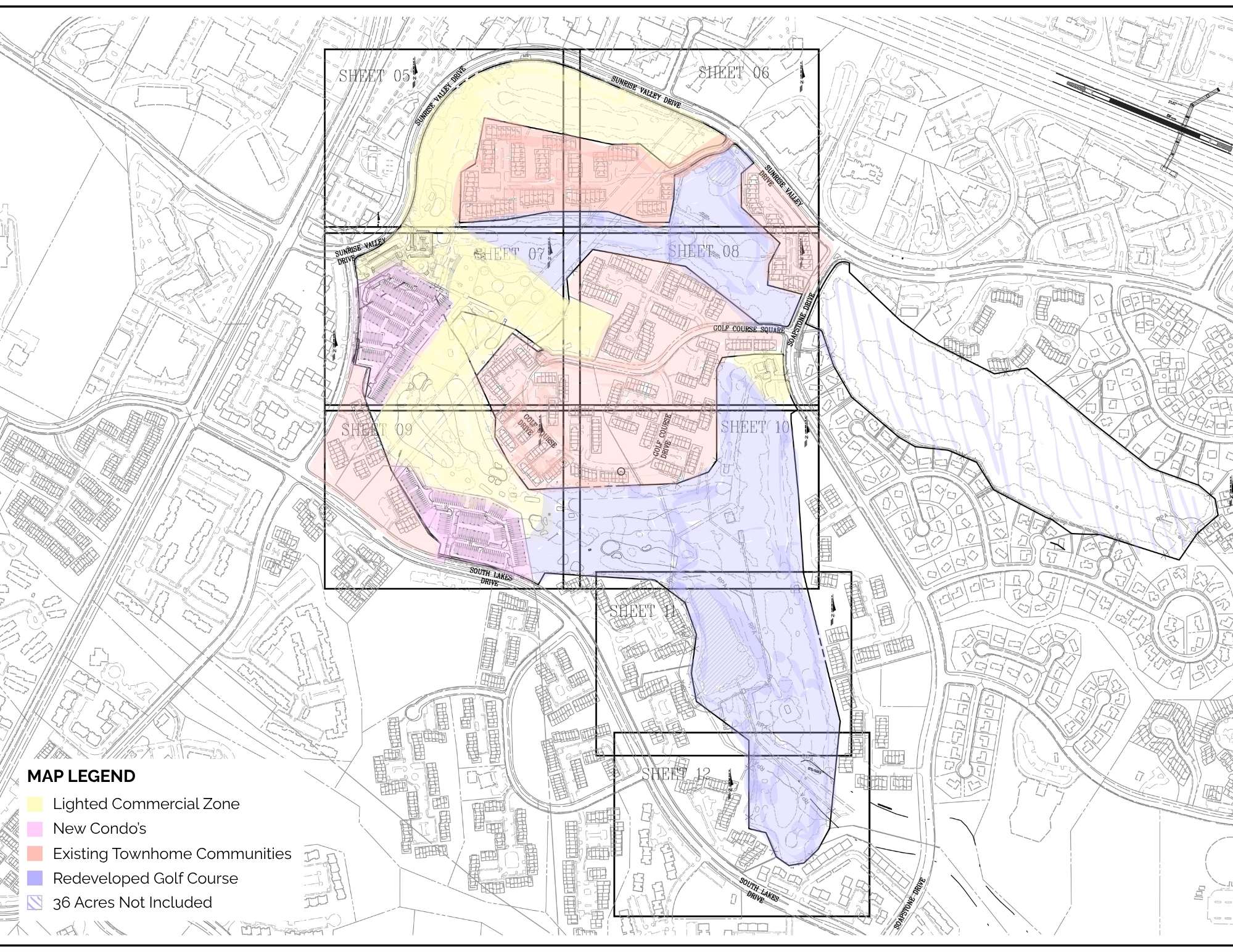 The driving range location is drawn — you can see exactly where it sits relative to existing homes. The night golf zone is completely undefined. Could be holes along Sunrise Valley. Could extend over the north condo clusters. Could run all the way down through the south land bay to South Lakes Drive. The filed documents do not say.