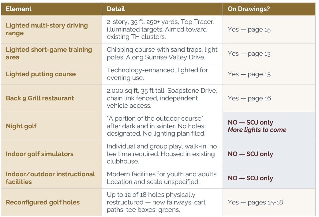 Three of eight commercial entertainment elements have no engineering drawings in the filed application. Night golf, simulators, and instructional facilities exist only as written commitments in the SOJ. The community is being asked to approve a commercial entertainment program where the most impactful element — night golf lighting — has no defined location, no designated holes, no photometric study, and no boundary showing where the light zone ends.