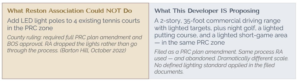 - Confirm that all proposed lighting — the 2-story driving range, lighted putting course, lighted short-game area, and night golf across ‘a portion of the course’ — complies with Reston’s PRC zone lighting standards. Provide the specific standard being applied and explain how it differs from the standard that prevented Reston Association from adding lights to four tennis courts at Barton Hill in 2022.