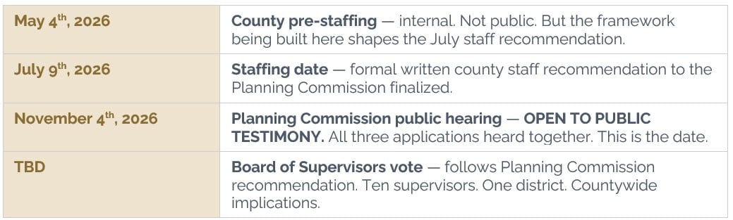 Plain language: there is a Board vote. All three applications go to the 12-member Planning Commission together on November 4th, 2026. The Board of Supervisors vote follows if it passes the Planning Commission. Supervisor Alcorn has a vote — and his office has put on the record that he does not find the developer’s administrative argument convincing.