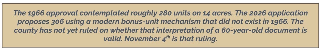 One more thing on the unit count: the press reported 288 units. The filed applications say 306. Supervisor Alcorn’s office confirmed this in writing on April 24th, 2026 — in response to my April 20th inquiry — and the county’s own case summary was updated accordingly. The public record now reflects 306.