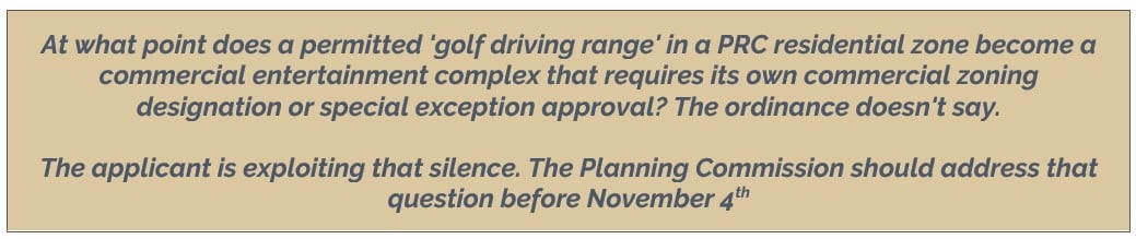 - Define at what scale, operating hours, or commercial intensity a permitted Category 5 ‘golf driving range’ use in a PRC residential zone becomes a commercial entertainment complex requiring its own commercial zoning designation or special exception approval. The current filed application proposes a 2-story, 35-foot, commercially operated, lighted-until-night facility with Top Tracer technology, a standalone restaurant, night golf, and indoor simulators. Where is that line?