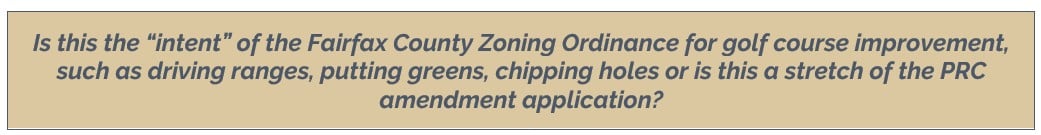 The Fairfax County Zoning Ordinance permits golf driving ranges as a Category 5 use in PRC residential zones. The applicant is using that language to argue that no separate commercial zoning is required for any element of the Commercial FunZone. Is this intent of the ordinance or a stretch for this amendment application?