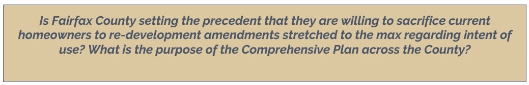 Reston has allies within the Hunter Mill District within the Planning Commission and Board of Supervisors. However, this is not a single Reston PRC issue and there are 11 other Planning Commission members and 9 other Board of Supervisors holding votes on sacrificing current home values as the cost of expanding the use of amendments in lieu of the SSPA process circumventing the Comprehensive Plan for Fairfax County.