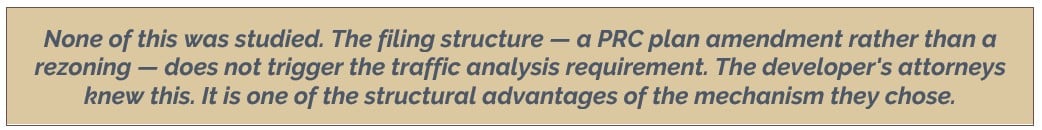 County transportation staff confirmed in writing on February 27th, 2026, that no TIA is required for this filing. Reason: it is a PRC plan amendment, not a rezoning. The applicant’s attorneys chose this filing structure knowing it avoided the traffic study requirement.