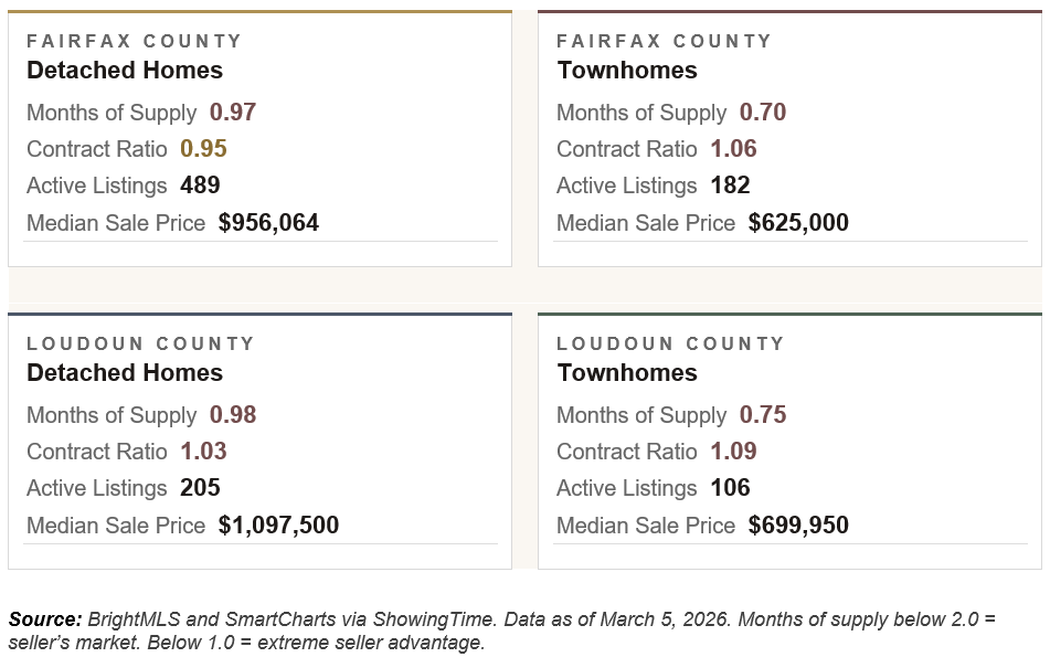 Data: BrightMLS and SmartCharts via ShowingTime, as of March 5, 2026. Fairfax County and Loudoun County, VA. Detached and Attached Townhomes. All analysis and opinion are my own and based upon local, real-time data.