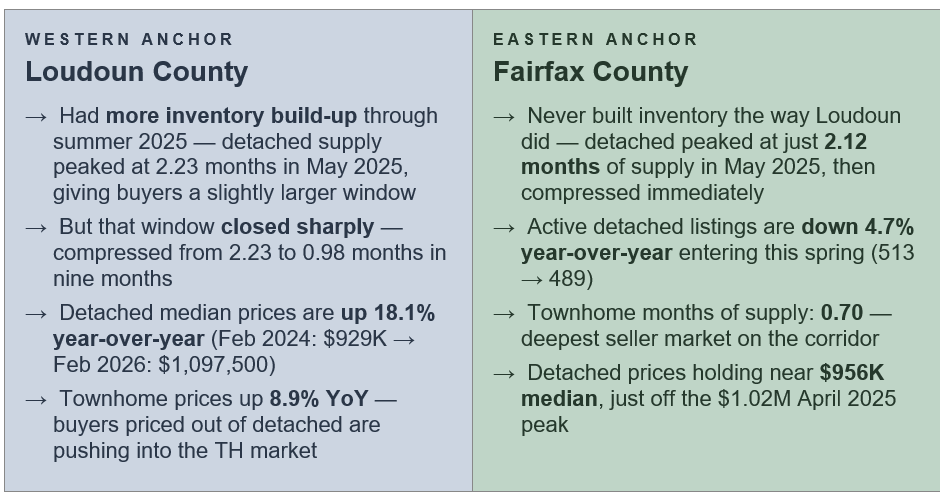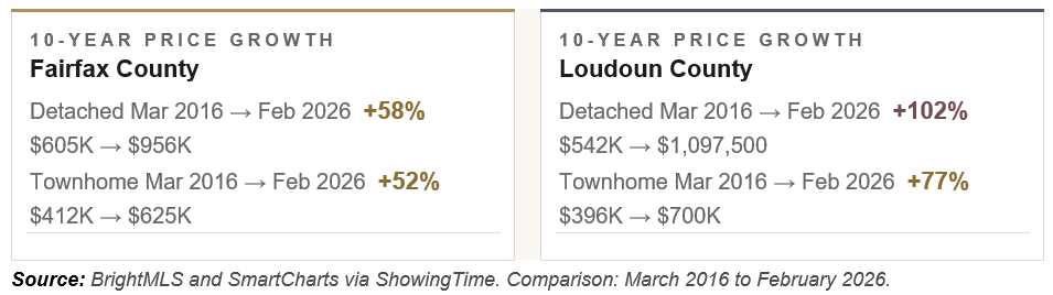Loudoun detached homes have doubled in value over 10 years. Fairfax detached homes are up 58%. These aren’t appreciation rates driven by speculation or irrational exuberance. They’re driven by a structural imbalance between supply and demand that has persisted for a decade — and shows no sign of resolving this spring.