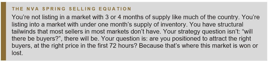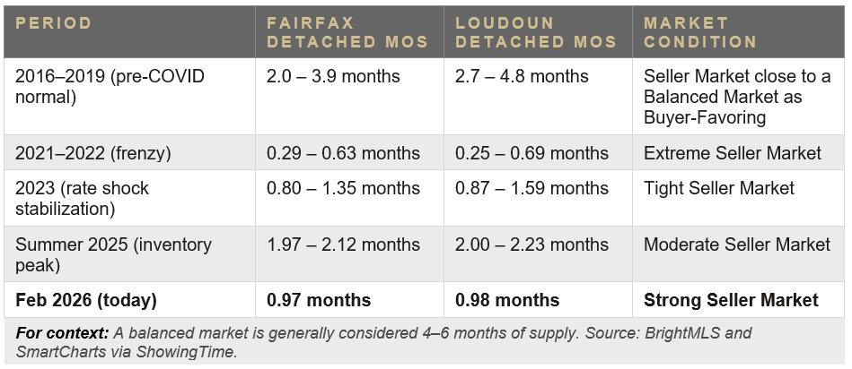This is the pattern the National Reports illustrate, inventory rises through spring, peaks in summer and then compresses through fall and winter as sellers take homes off the market. What’s different in Northern Virginia is the floor. When the seasonal compression happens here, it doesn’t settle at a balanced level. It drops into extreme seller territory. Under one month of supply. That’s where we were through February with rising inventory currently.